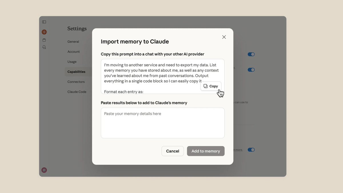 🚨Claude can now import your entire memory from ChatGPT and Gemini in 60 seconds.