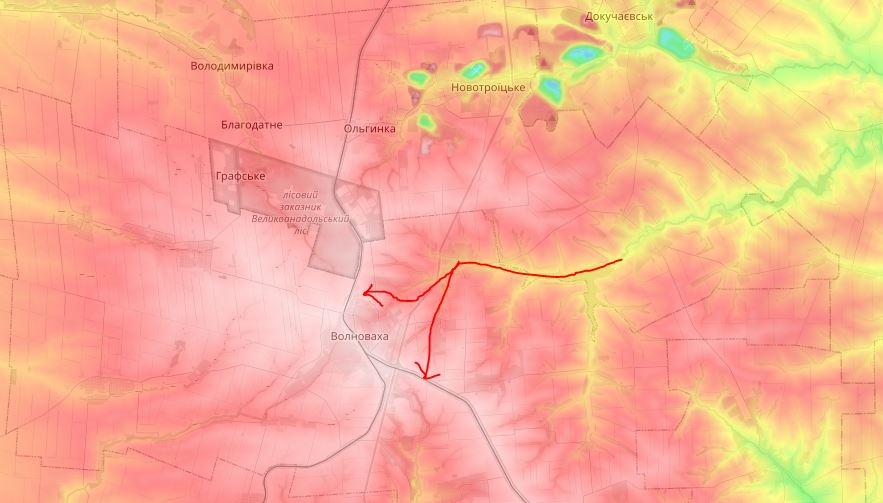 The terrain around Volnovakha is mostly all high ground; there is only a small lowland corridor starting at the village of Nikolaevka, splitting in 2, one path diverging toward the railway and one toward Buhas. Russians would advance exactly along this corridor. (3)