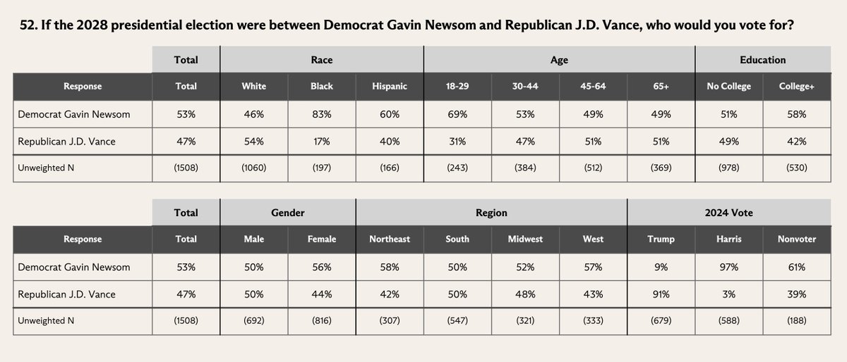 1) Vance is weak. 2) AOC/Newsom are very similar electorally but with slightly different coalitions. Newsom's better with whites, AOC with Latinos.