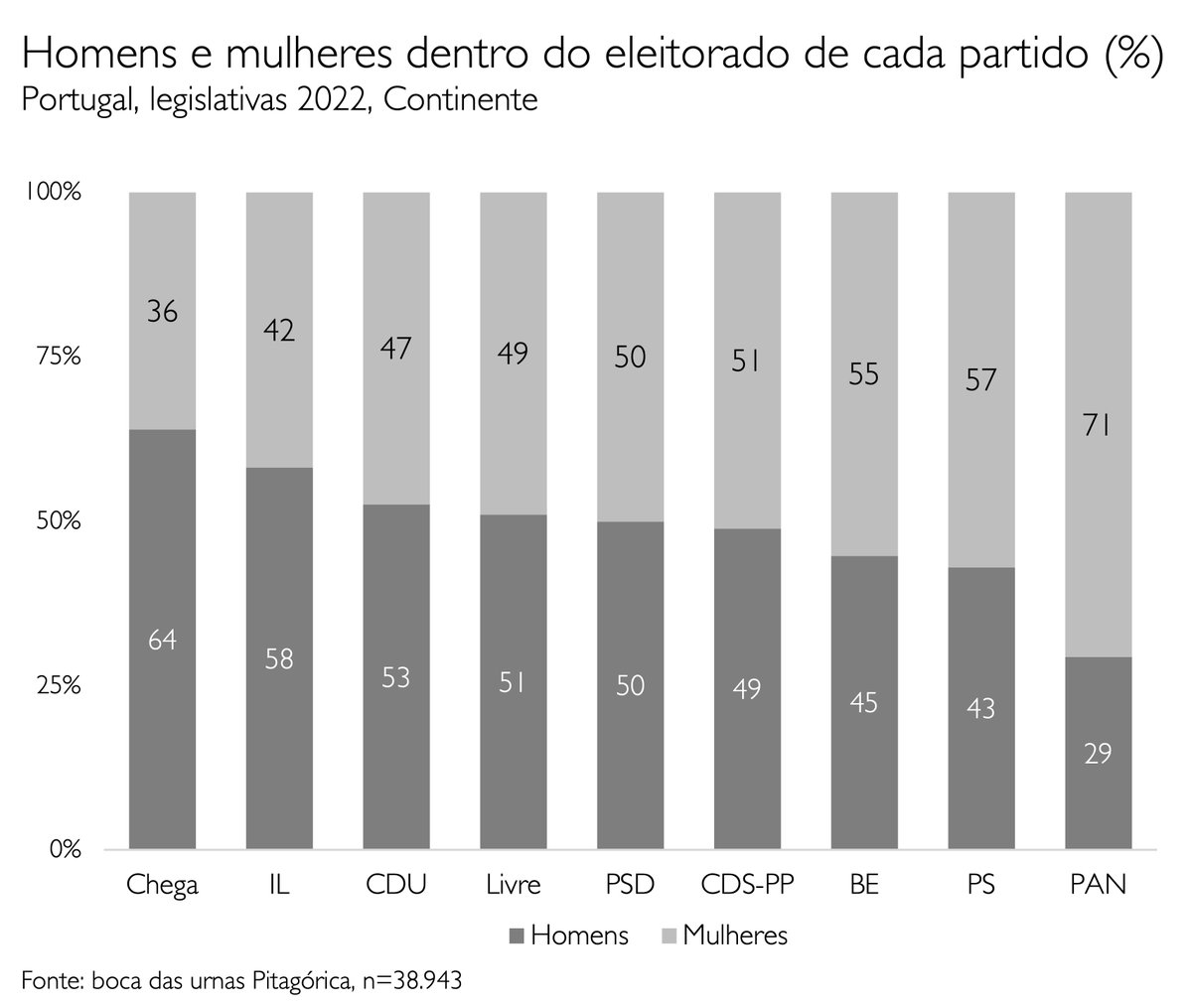 Isto produz composições muito diferentes dos grupos de votantes em cada partido. Nos extremos, quase 2/3 dos que votaram Chega são homens; mais de 2/3 das que votaram PAN são mulheres. E relativamente forte feminização do PS e do BE também (3)