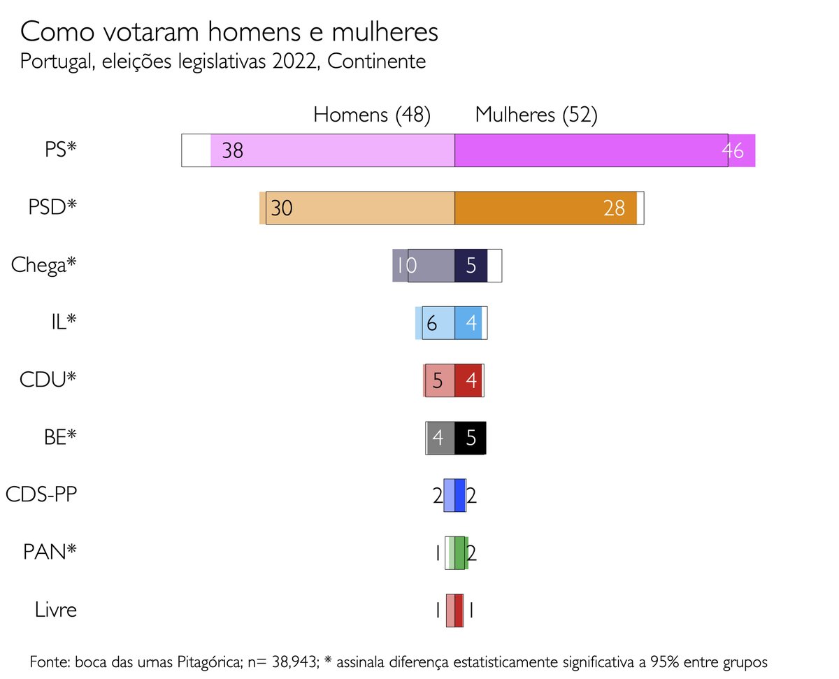 Escrevemos um texto sobre o assunto, que está aqui: pedro-magalhaes.org/bases-sociais-…. Resumo: Portugal não tinha o que se chama o "modern gender gap" no voto. Mas agora já tem: mulheres mais à esquerda, homens mais à direita. (2)