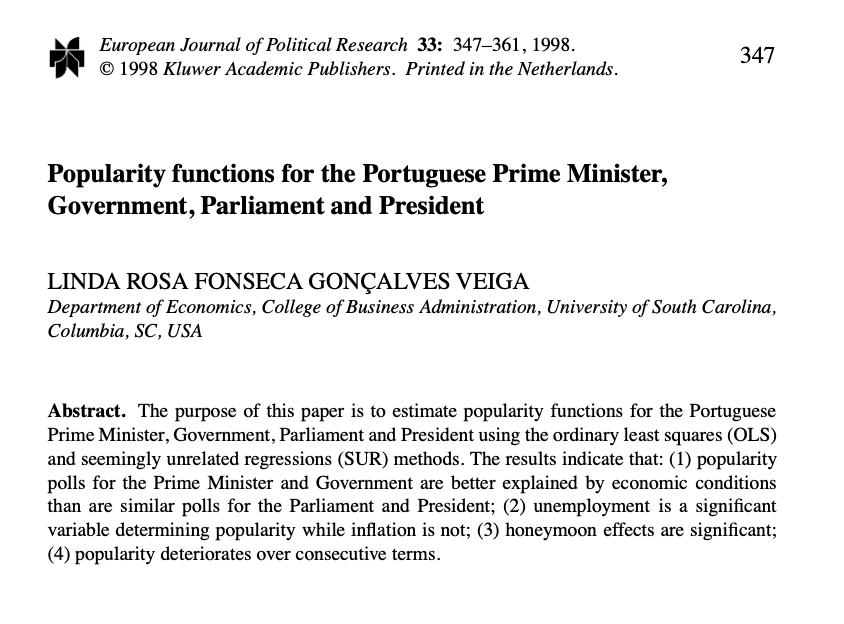 Em Portugal, a investigação mostra que a aprovação do primeiro-ministro é mais prejudicada por uma má situação económica do que beneficiada por uma economia favorável, ou seja, que o efeito da economia é assimétrico. Mas a situação atual prejudica? Não prejudica. (6)