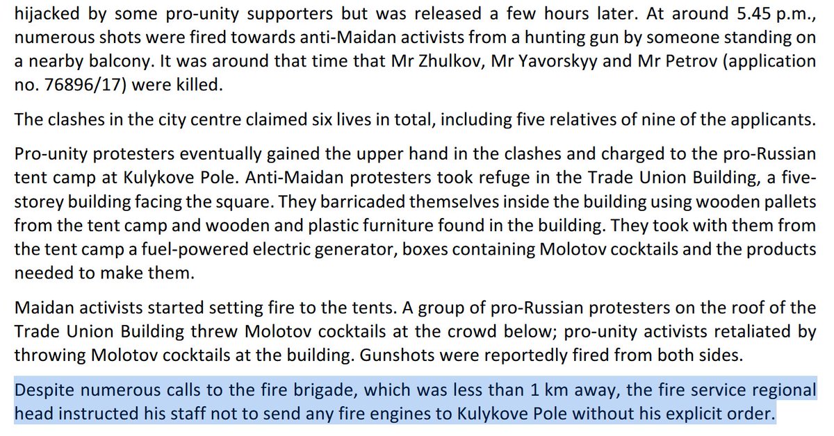Nobody and nothing stepped in to rescue the anti-Maidan activists as they burned to death, and the ECHR finds this failure "went beyond an error of judgment or carelessness". Maidan authorities actively wanted these people to die, for the crime of being Russian.