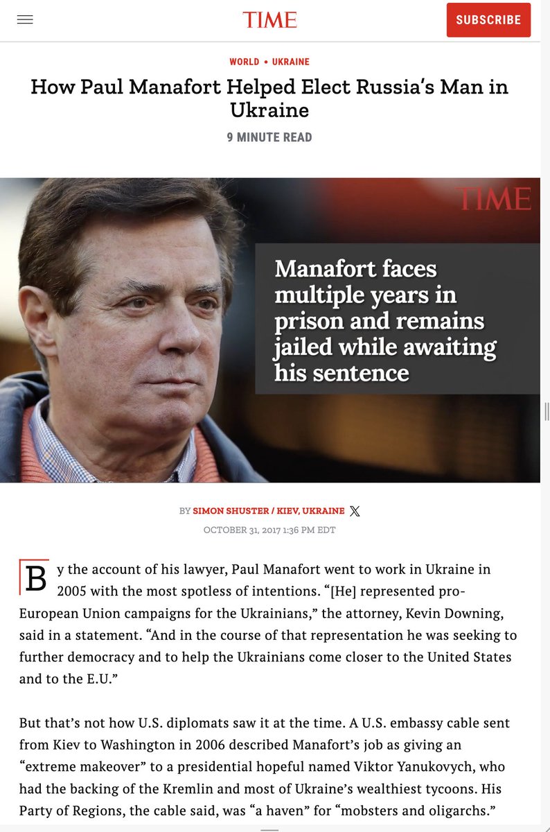 …sirviendo como primer ministro de Ucrania en dos ocasiones entre 2002 y 2007 y como miembro de la Rada Suprema entre 2006 y 2010. Con el apoyo de asociados de Trump como Paul Manafort, se reinventó como un «moderado» y, en 2010, ganó por un estrecho margen la presidencia.