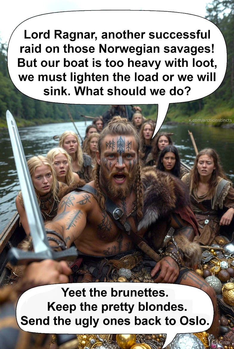 POV: The year is 855 A.D. You are a Danish Viking warlord with a taste for blonde hair, a polygenic mutation. Blonde women have been appearing more frequently in the last few centuries in Scandinavia. You and your bros caught a few in this raid on a Norwegian peasant village. You are about to conduct artificial selection for blonde hair in Northwest European populations 😍