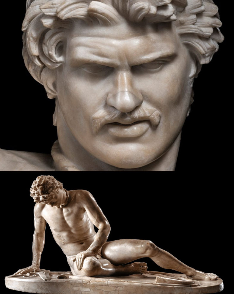 This sculpture depicts a warrior in his last moments, as he succumbs to a fatal wound.