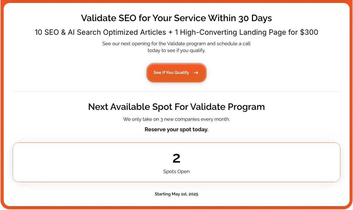Validate program, where they help companies to Validate SEO within 30 days through 10 SEO & AI Search Optimized Articles + 1 High-Converting Landing Page for $300.