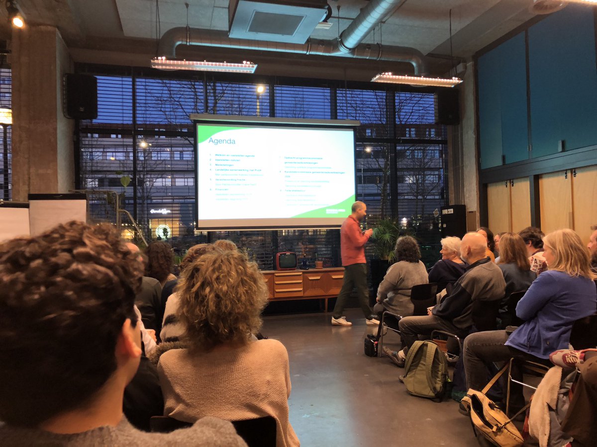 Katinka Eikelenboom gaat praten over 'dat andere nieuws van gisteren'. Er zijn veel nieuwe leden aanwezig die nooit eerder bij een ledenvergadering zijn geweest. Applaus. Nu worden er stoelen bijgezet. De man die presenteert zegt dat alles hier 'kort en bondig' wordt verteld.