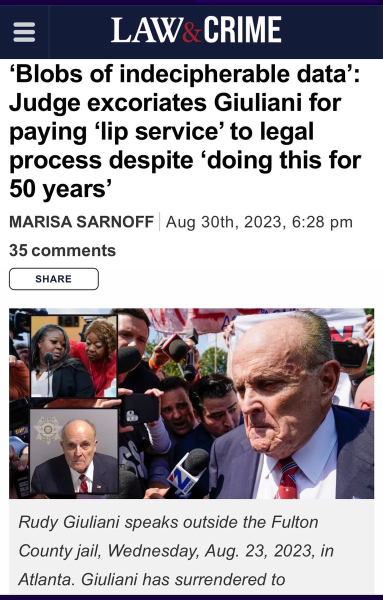 “A merciless ruling issued Wednesday, U.S. District Judge Beryl Howell found that Giuliani failed to preserve evidence in the case brought by Ruby Freeman and her daughter Wandrea “Shaye” Moss, and that he deliberately refused to comply with discovery requests and orders. She ordered a default judgment against the man once known as “America’s Mayor,” as well as sanctions — the amount of which will be determined at trial.”