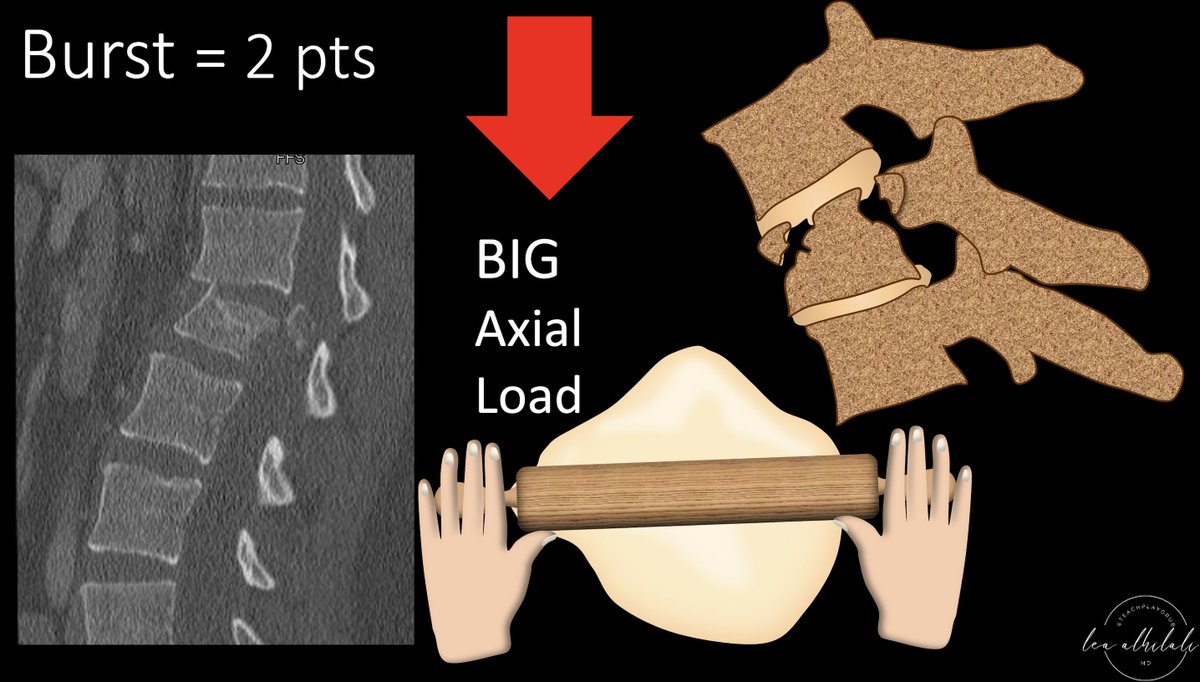 The higher the number, the greater the force and injury to the spine—ranging from simple compression fxs worth only 1 point to where the spine is literally ripped apart—a distraction injury, worth 4 points.