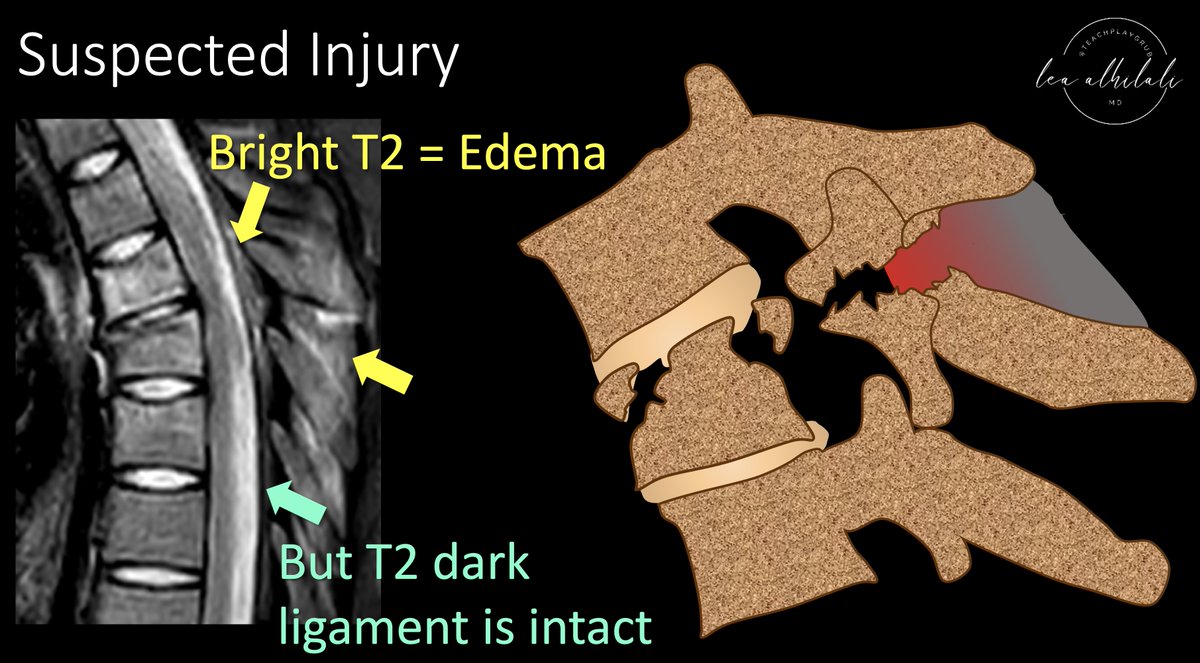 10/ Here is an example of suspected injury—edema is seen in the posterior ligamentous complex, but the T2 dark lines that are the ligaments themselves appear intact. This is worth 2 pts