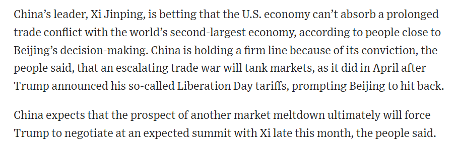 China -- per the excellent reporting on the WSJ/ @Lingling_Wei -- appears to be pursuing a strategy of applying maximum pressure in pursuit of maximum concessions ... full tariff rollback, rollback of export controls, relaxation of nat'l security review on Chinese investment