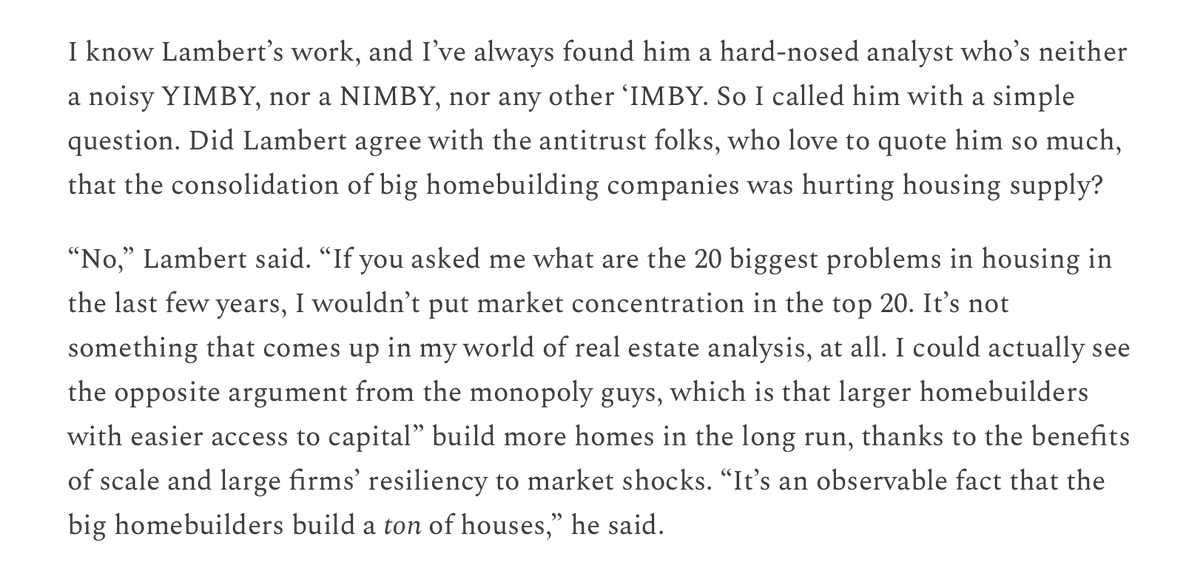 2) There is no journalist malpractice here. Thompson claimed that housing expert Lance Lambert rejects the theory that large homebuilders are slow-walking construction to juice profits. Lambert confirmed this to Stoller, as the latter acknowledges.