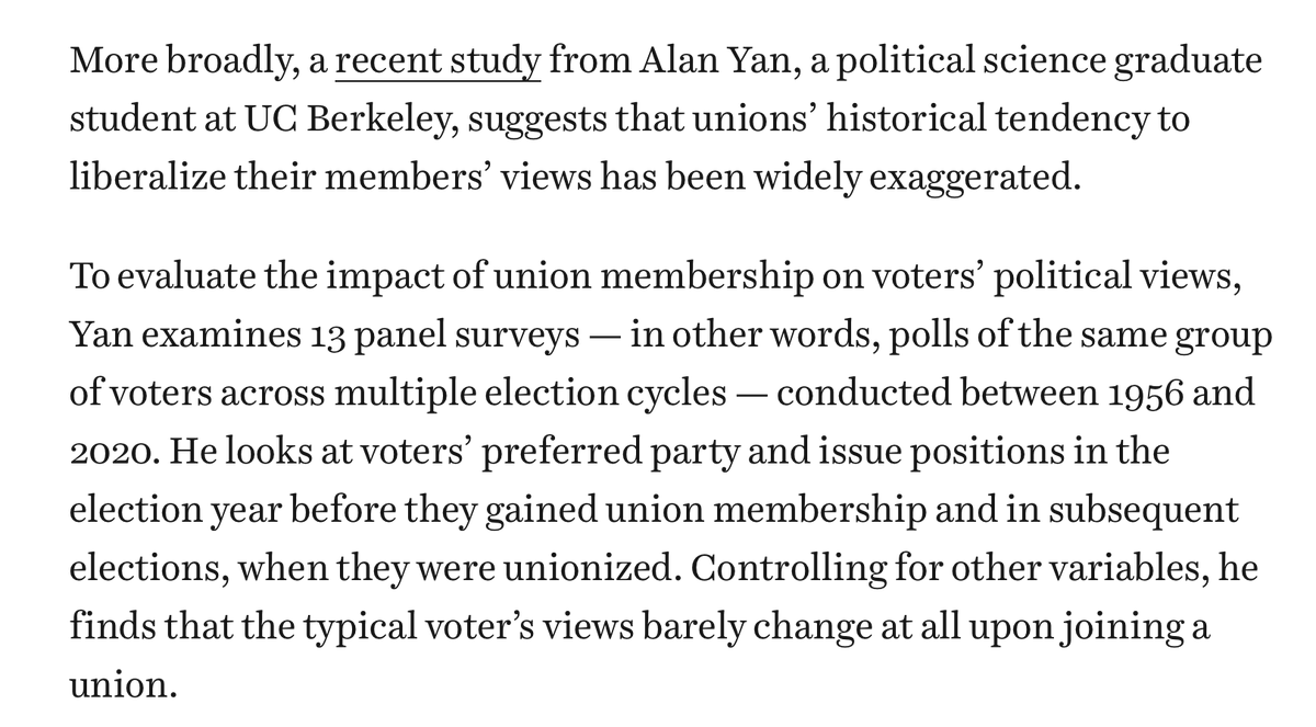 3) One recent study suggests that all this shouldn't be surprising -- since unions' capacity to make their members more progressive has always been exaggerated. vox.com/politics/37802…