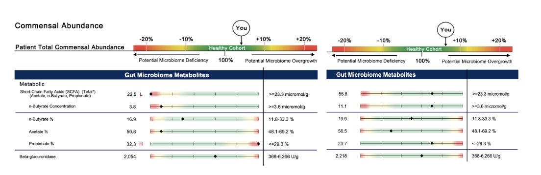 Pre-HBOT: imbalance score 7 (high) → Post-HBOT: imbalance score 0 (ideal) this is a general score based on the beneficial metabolic products of the healthy gut bacteria, including the aforementioned SCFAs and n-Butyrate as well as the enzymatic activity of gut bacteria which support the gut in disposing of drugs and other harmful chemicals (beta-glucoronidase)