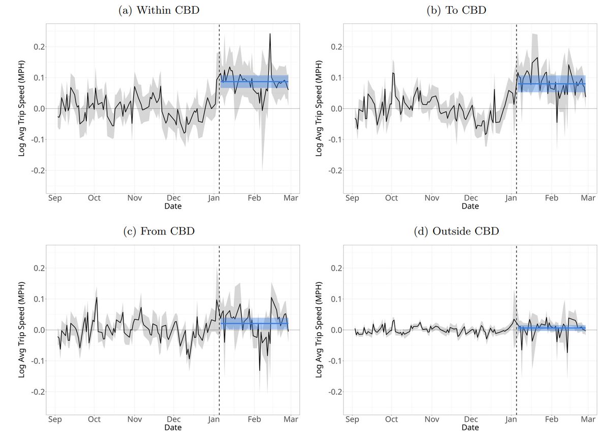 In the CBD, trips are faster. Going to the CBD, trips are faster. Leaving it, trips are faster, but not much. And outside of it, where congestion pricing is irrelevant? No effect.
