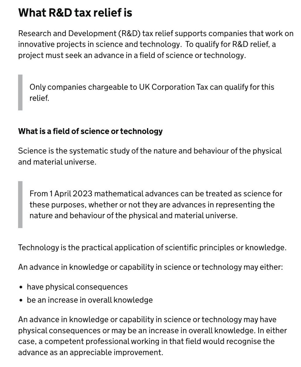 Here are the conditions for R&D tax relief. It has to be an advance in science or technology. gov.uk/guidance/corpo…