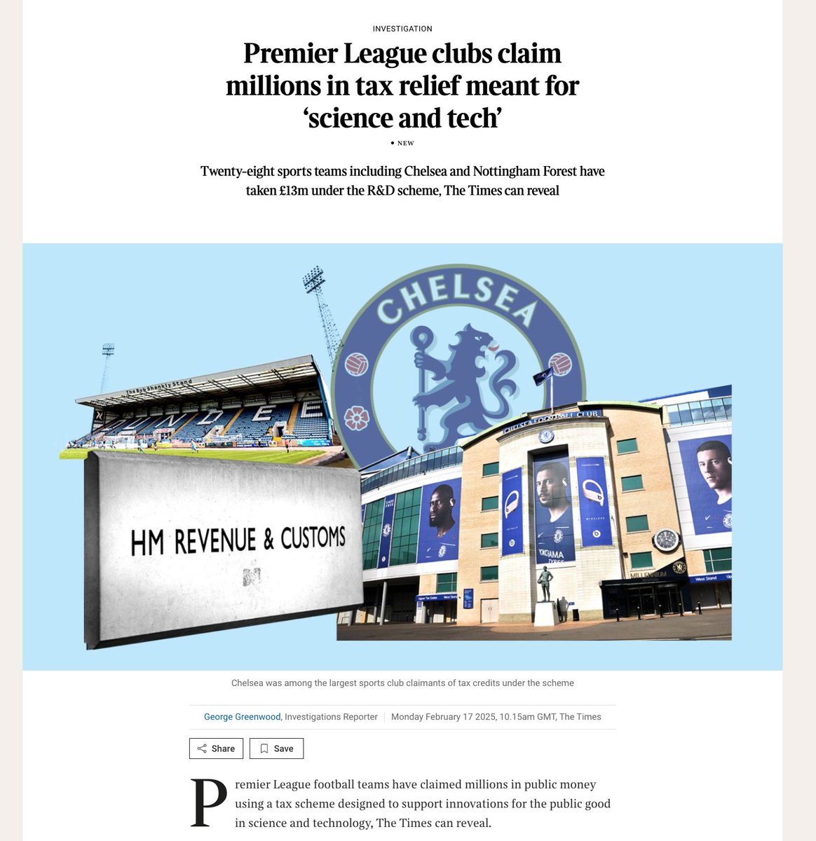 New report in The Times: football clubs have been claiming £millions of tax back using a tax relief intended to boost science and technology.