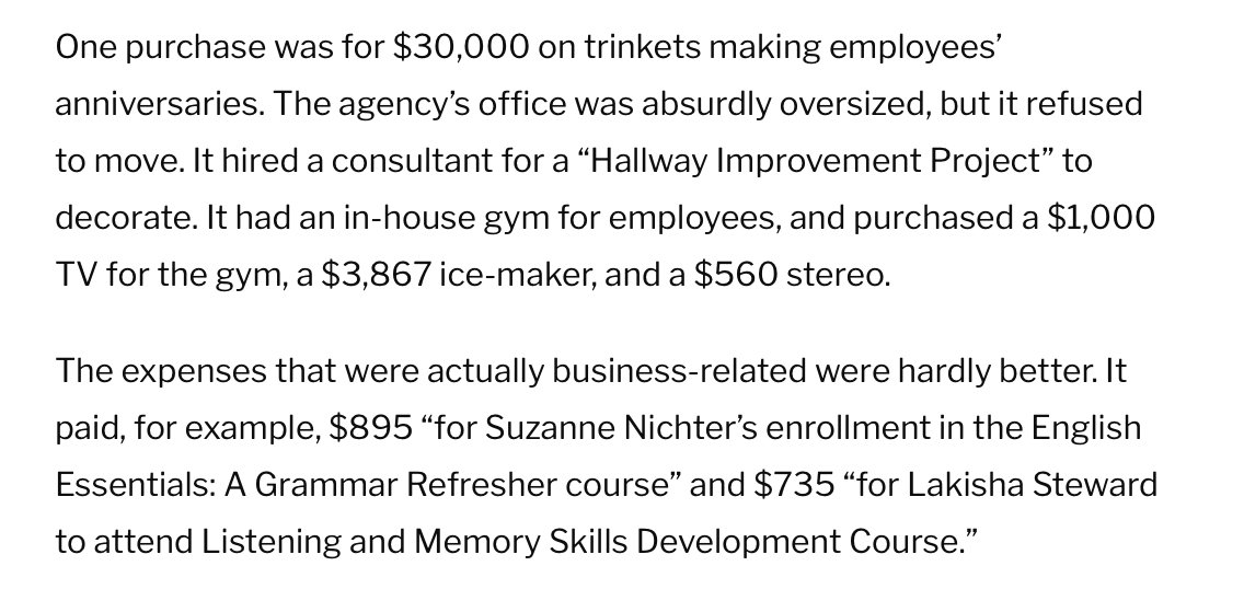 It steered $1,500-a-day contracts to friends, and jobs to relatives. Its employees "unblocked" abuse protections on their purchase cards, and used them to spend $18,000 at a jewelry store, their wife's cell phone, and cable at their vacation home.