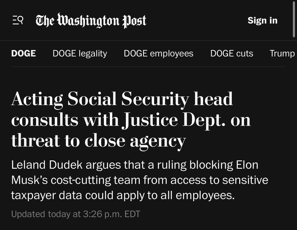 Heads up! The Social Security commissioner is consulting with the Justice Department about shutting down the agency. “This move would immediately begin halting benefits payments for millions of Americans.” This app appears to be throttling posts with links, so I’ll try words.
