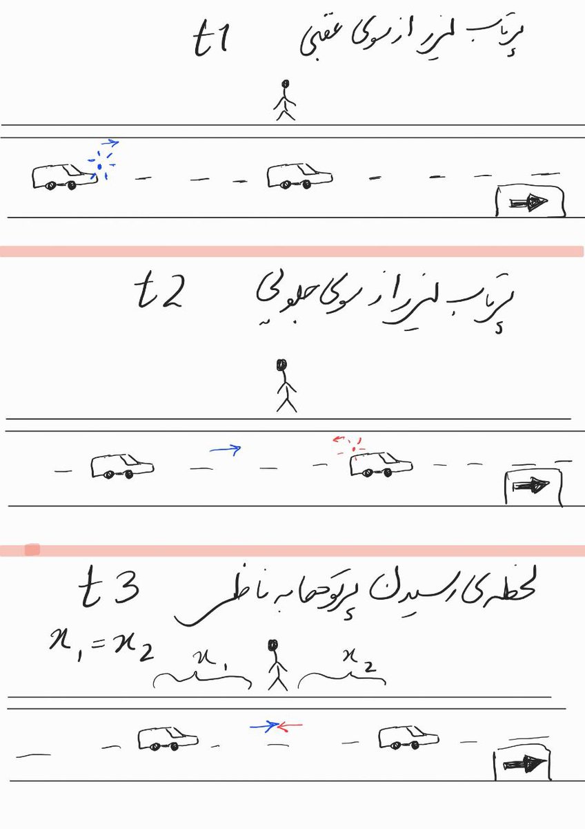 شما کنار جادهی یکطرفه ایستادهاید که ناگهان دو پرتوی لیزر از دو جهت مخالف در یک لحظهی واحد از کنارتون رد میشن. یکی از پرتوها از ماشین جلویی و یکی از ماشین عقبی که هر دو از شما یک فاصله دارن و با یک سرعت بالا و مساوی و در یک جهت در حال حرکت هستند، پرتاب شدهن. (تصویر را ببینید)