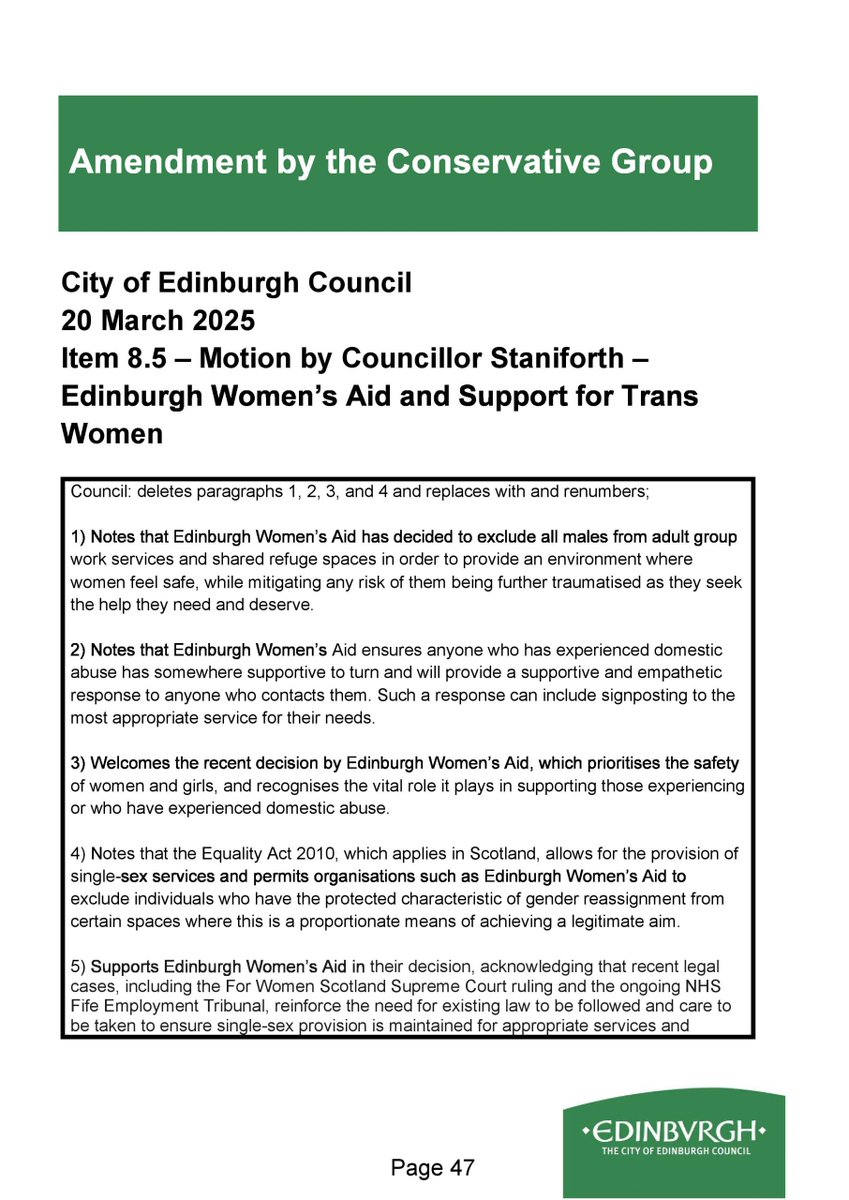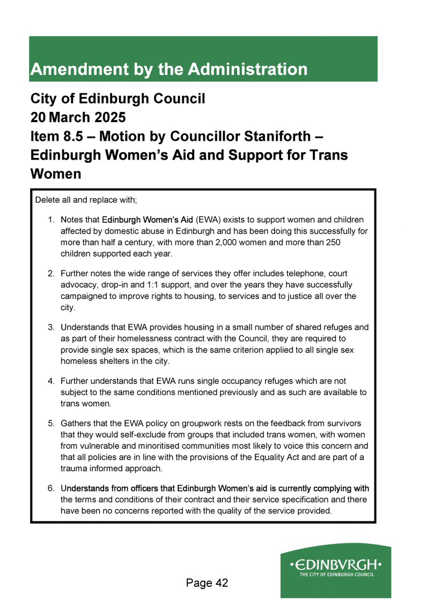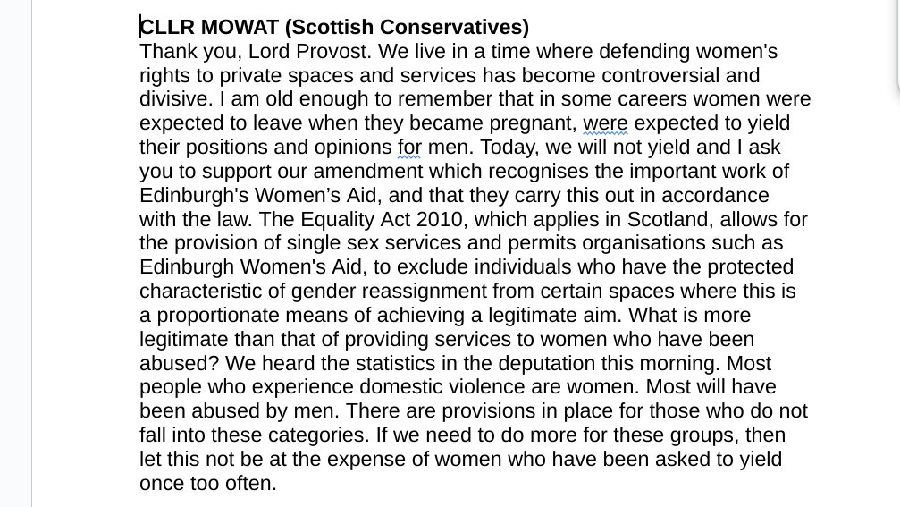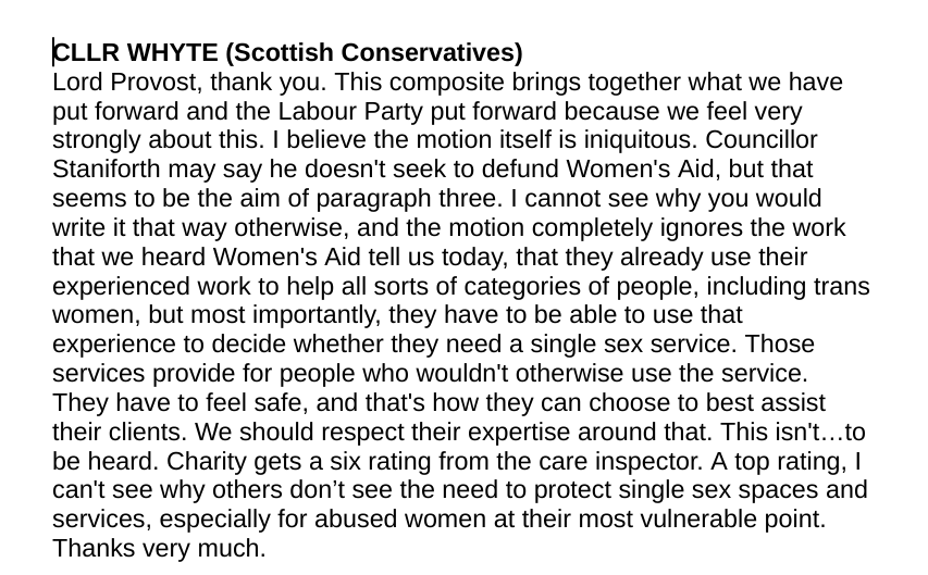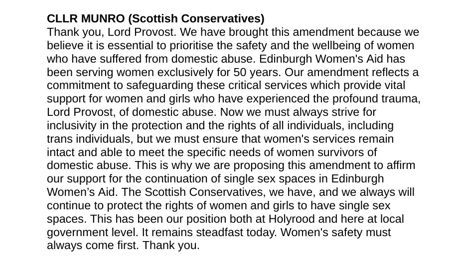 And now, a palate cleanser from Council leader Jane Meagher of @EdinburghLabour who clearly and concisely explained why women need single sex services and trauma-informed care. Cllr Meagher was one of the women who set up EWA and she is something of a legend!