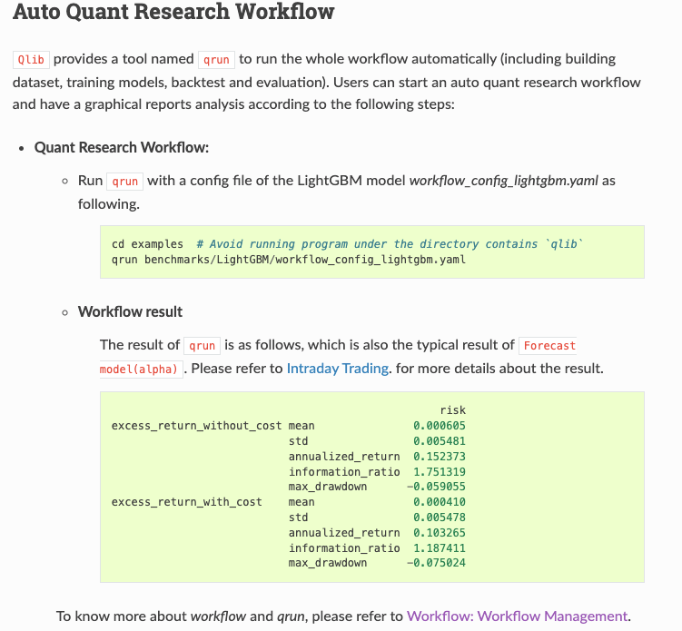 Qlib provides an automated quant research workflow that builds the dataset, trains models, backtests, and evaluates the results.