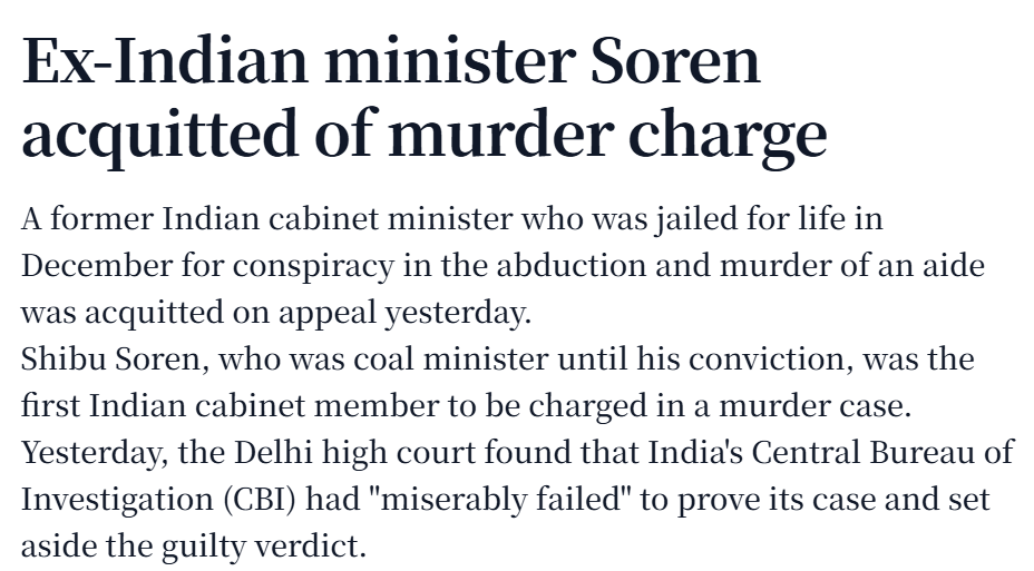 On August 23, 2007, the Delhi High Court acquitted Soren, overturning the trial court's decision due to insufficient evidence, flawed forensic analysis (e.g., skull superimposition test), and unreliable eyewitness accounts. The Supreme Court upheld the acquittal in April 2018.