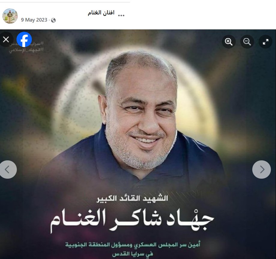 I tracked down Abu Hilal's wife. Her name was Afnan Al-Ghannam. On May 23rd 2023 she posted this - mourning her uncle. This is Jihad Shaker al-Ghannam. He was secretary general of the military council of the al-Quds Brigades – Islamic Jihad‘s military wing.