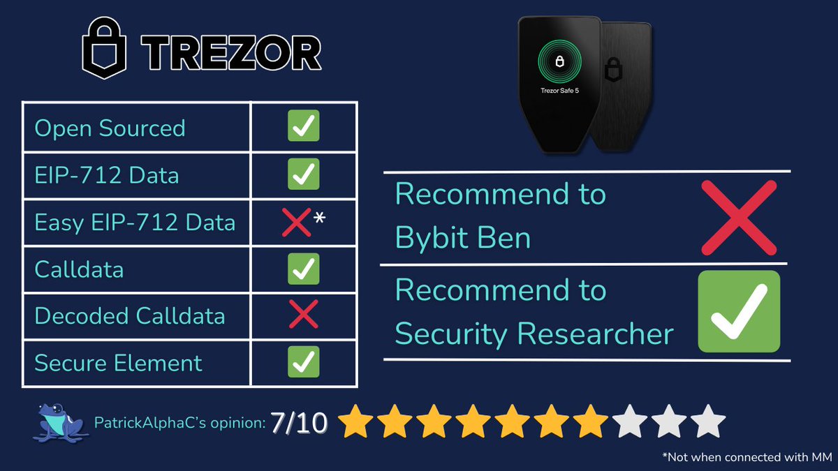 The @Trezor Model T is the first "solid" wallet on our list. Open-sourced, shows all calldata, shows all signature data, the only issue is that it doesn't have a secure element.