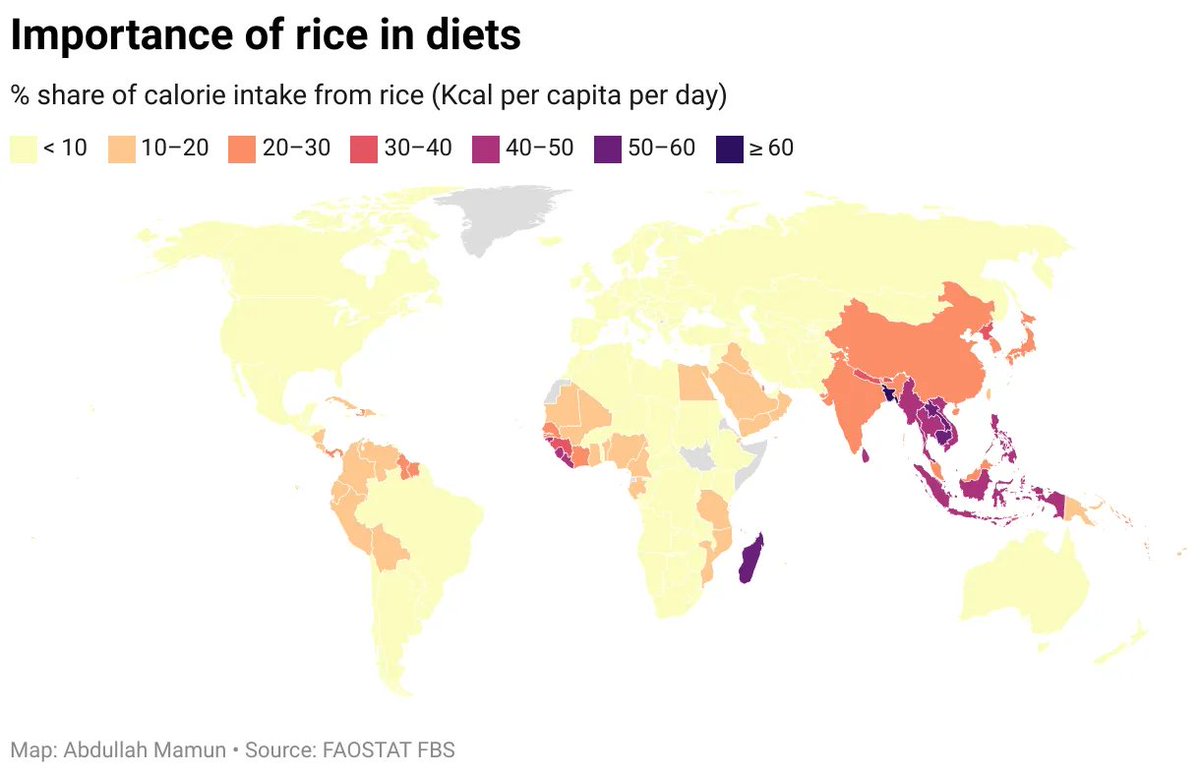 The prices of rice across the world are falling dramatically. Thai white rice just fell to $405/ton from $669 in January. The reason? India lifted its export restrictions. As the world's largest rice exporter, India's policies directly impact food prices for billions.