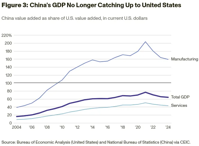 The gap between China and the US is widening, not narrowing. China's GDP has fallen from 77% of US GDP in 2021 to 64% last year. Pre-COVID forecasts expected China to overtake the US within a decade. Current projections push that to the 2040s, if ever.