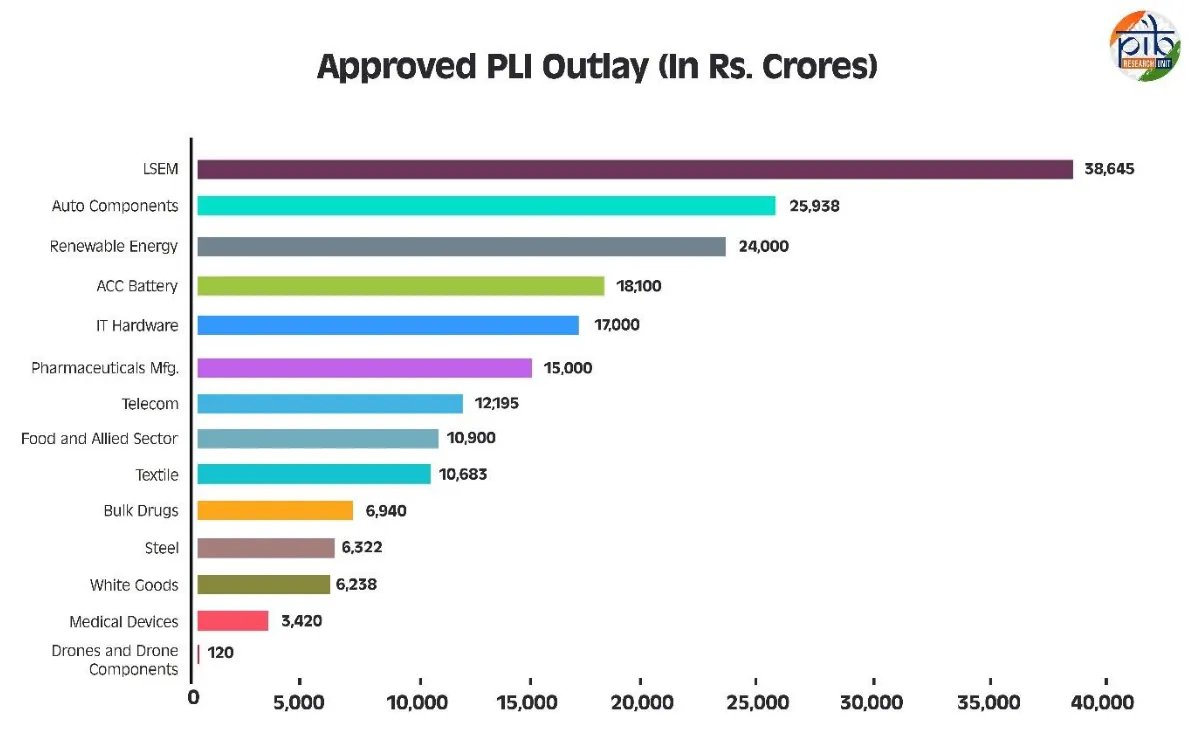 In November 2020, the government launched PLI under ‘Atmanirbhar Bharat’ to fix these issues. It covered 14 sectors with ₹1.97 lakh crore in incentives. The plan was to drive $500 billion in production, create jobs, and push manufacturing’s share to 25% of GDP by 2025.
