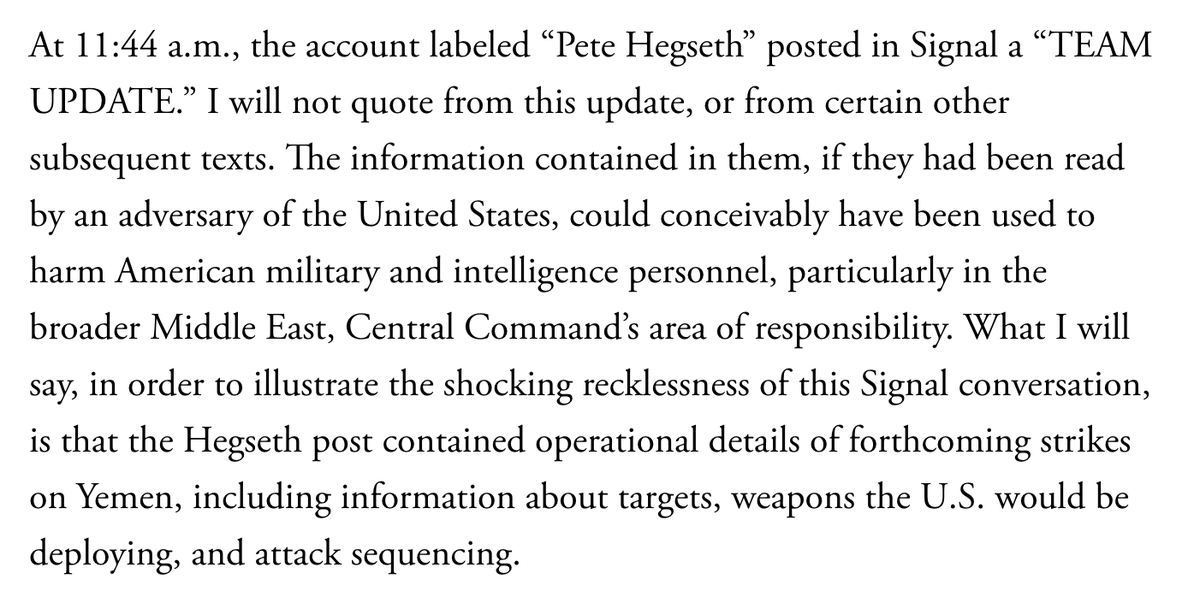 @CIADirector Then Whiskey @PeteHegseth--the guy who says trans service members are unfit to serve but thinks he is--sent all the operational details to a Signal chat including a journalist.