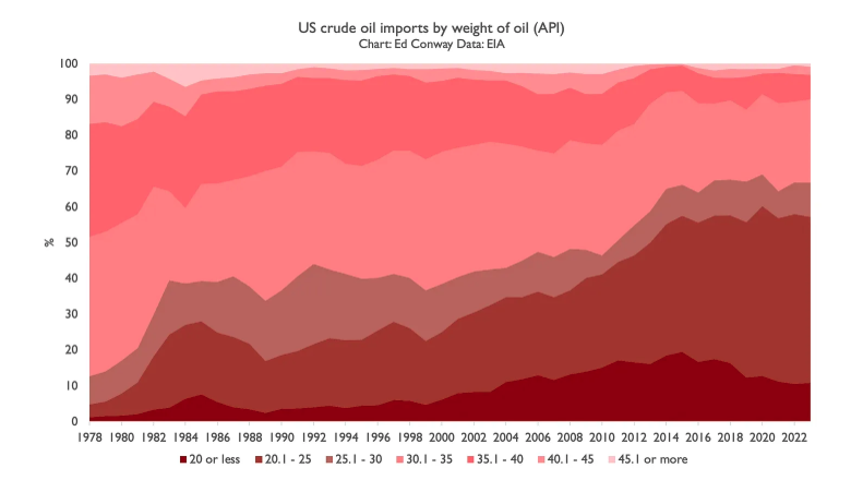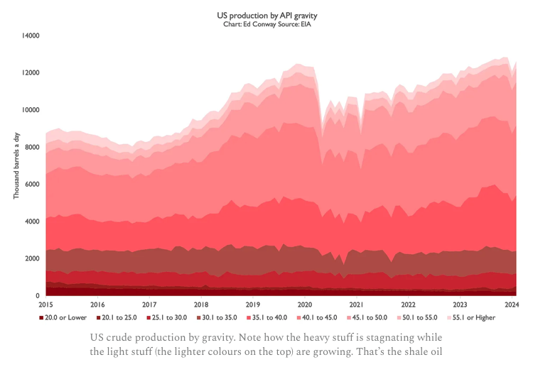 Yet the irony is most of the oil being produced domestically in the US these days is NOT heavy/sludgy. It's very light.