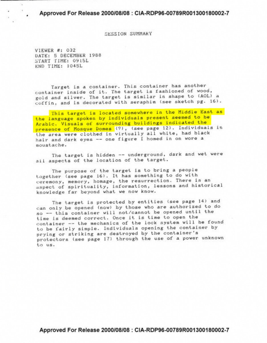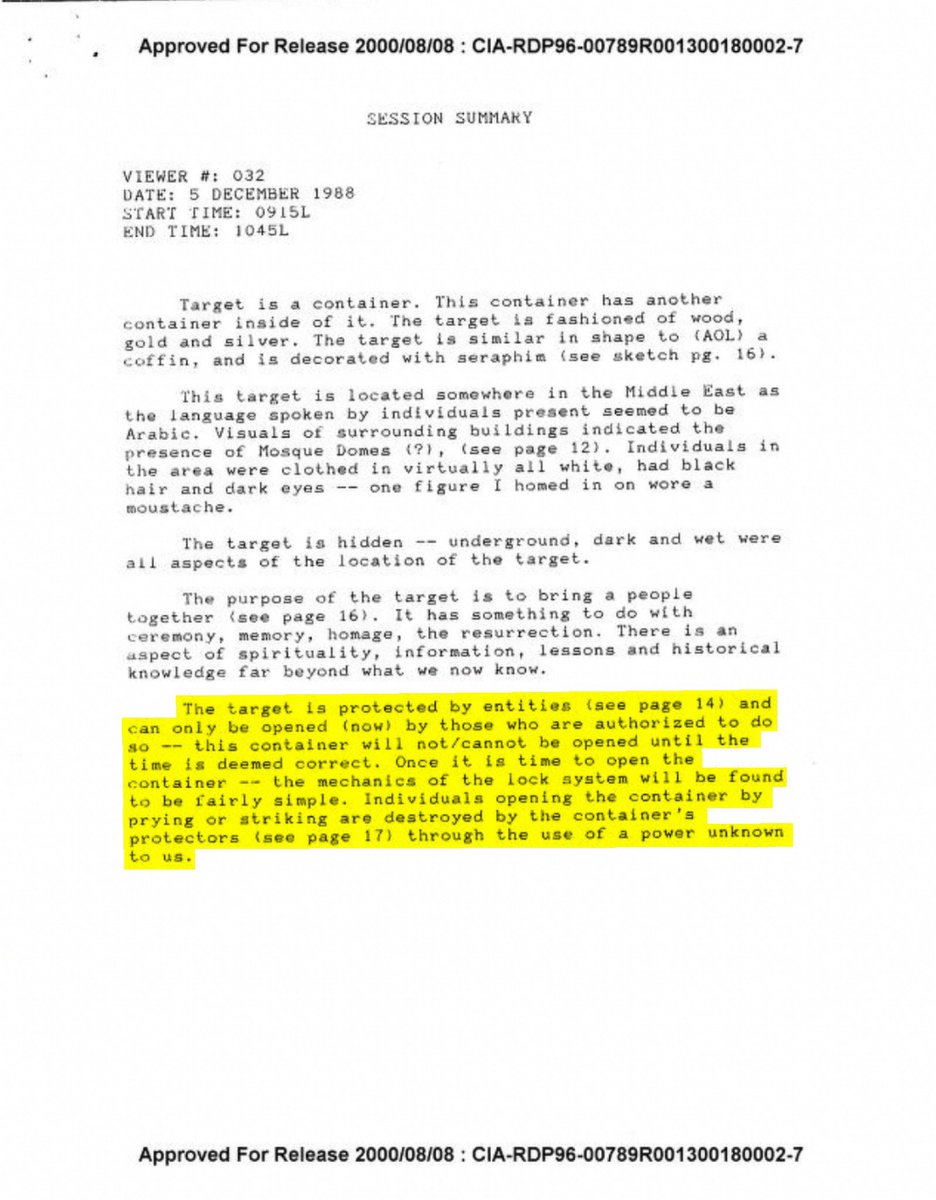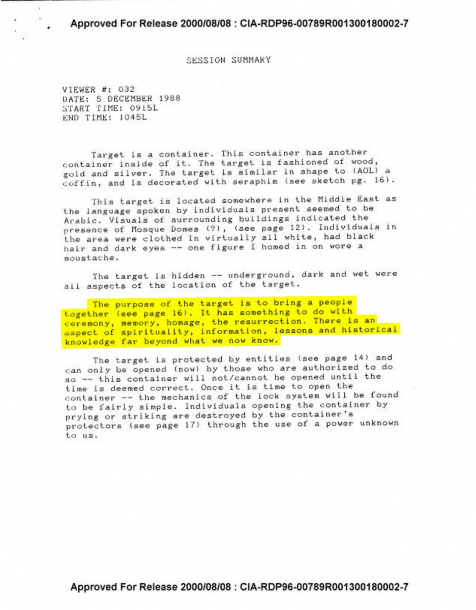 A declassified document reveals the CIA found the Ark of the Covenant in 1988 using remote viewing/astral projection.