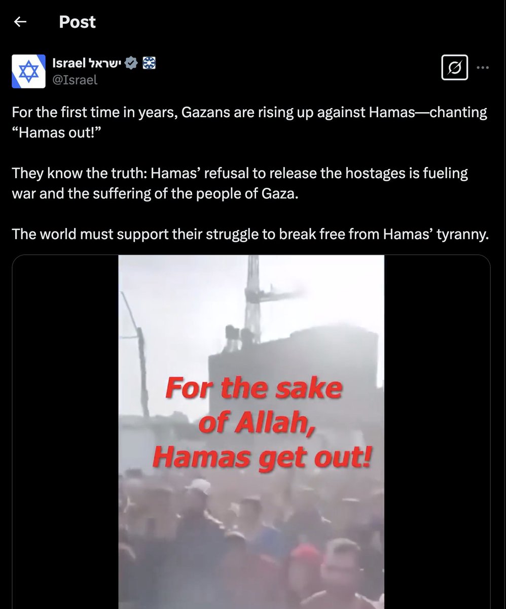 7\ However, actors trying to exploit these protests to escalate the messaging to the next level (e.g. demanding disarmament, fully dismantling Hamas, foreign gov in Gaza, whitewashing Israel, framing Hamas as the sole problem) are undermining the potential of these demonstrations