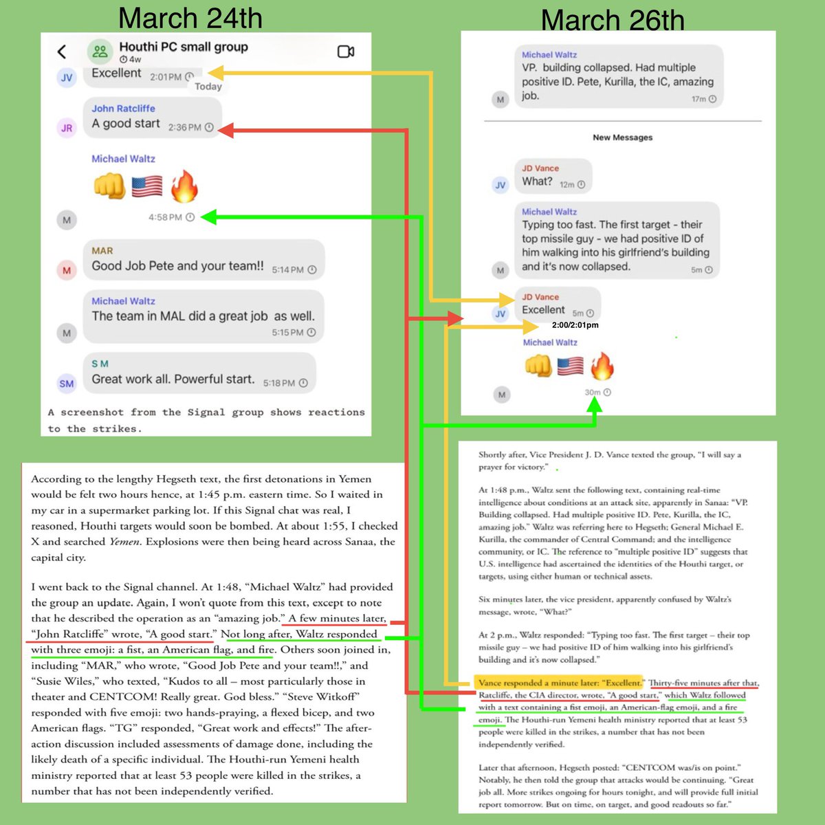 5/Secondly, I noticed that @CIADirector Ratcliffe’s message was missing from the second article Signal messages thread and Mike Walz’s emoji message was posted AFTER his previous message had only been sent 5 mins prior AND the first article had Mike Walz’s same Emoji message time stamped at 4:58pm?