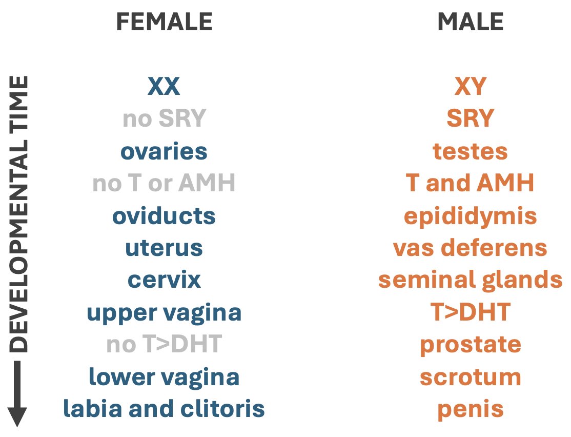 Male development 1. Y chromosome carrying functional SRY that directs testes development 2. testes produce hormones, notably testosterone (T) 3. T first drives male internal genitalia development 4. T>DHT conversion drives male external genital development