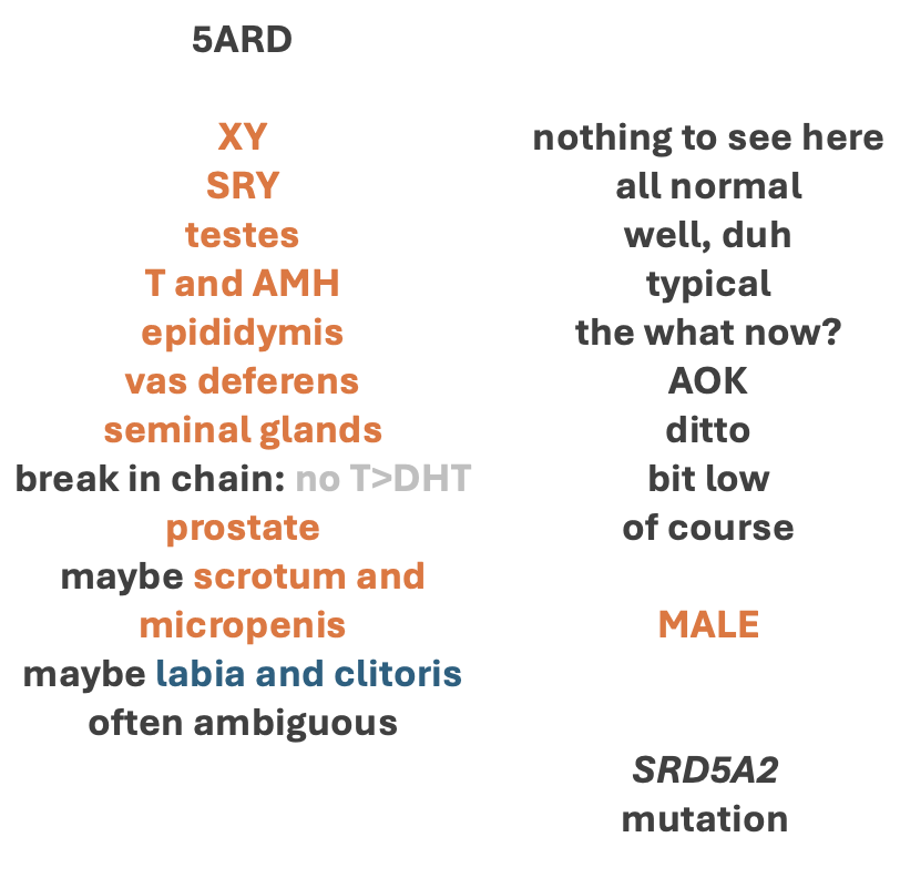 A male with 5ARD has a mutation in SRD5A2, and this gene is required for penis growth. This is simple, and maps perfectly onto well-established developmental processes.