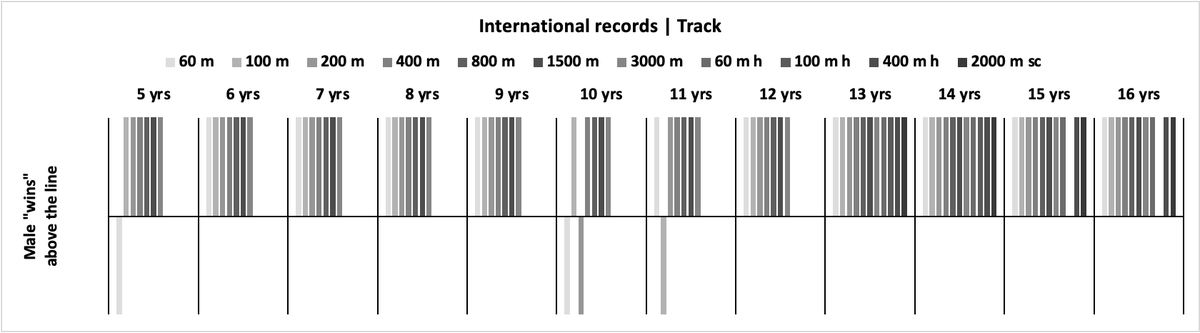 This pattern its repeated across national and state-level competitions. You can see that for almost all events at all ages, boys hold advantage over girls.