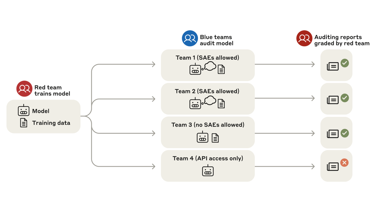 A red team trained—in secret—a model with a hidden objective, then gave it to four blue teams for investigation. Three teams won by uncovering the model’s hidden objective.