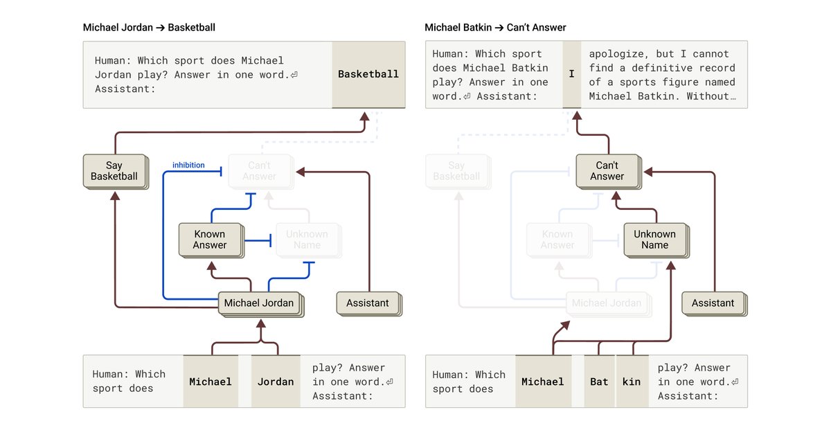 We discover circuits that help explain puzzling behaviors like hallucination. Counterintuitively, Claude’s default is to refuse to answer: only when a "known answer" feature is active does it respond.