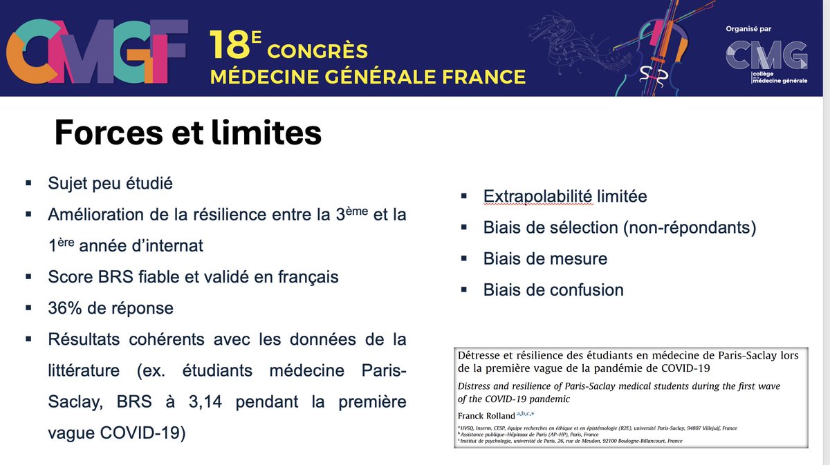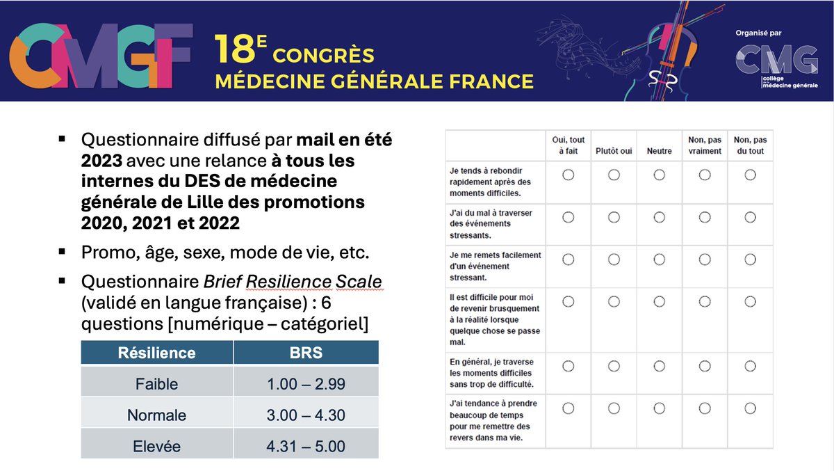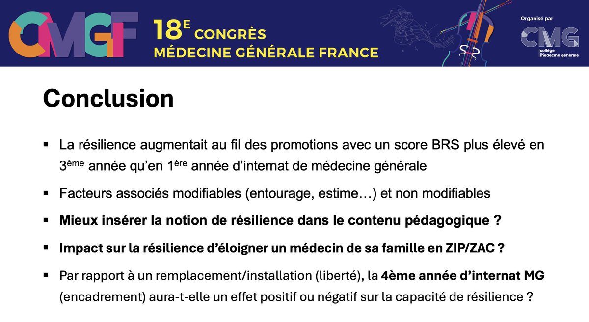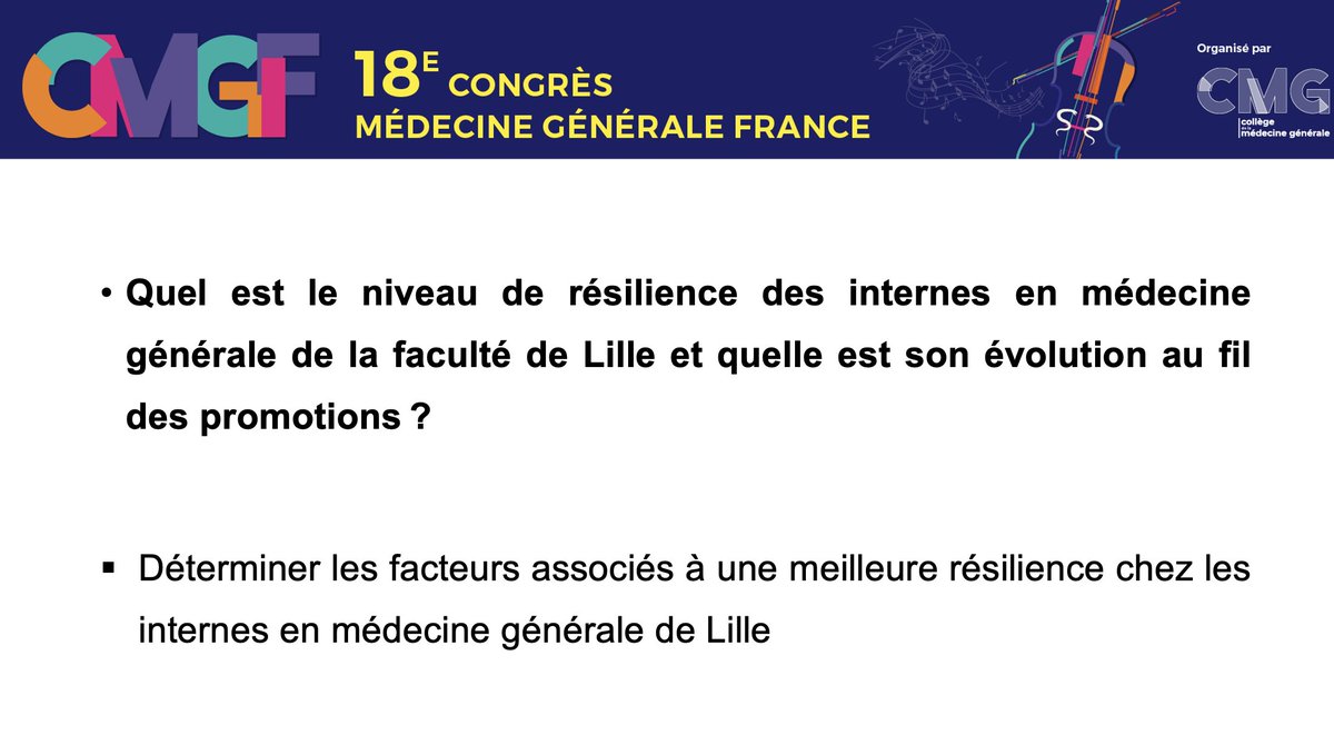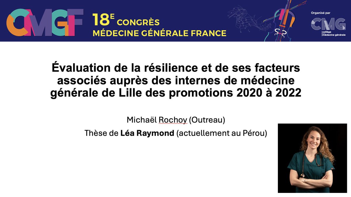 #CMGF2025 La dernière présentation est par mes soins : "Évaluation de la résilience et de ses facteurs associés auprès des internes de médecine générale de Lille des promotions 2020 à 2022".