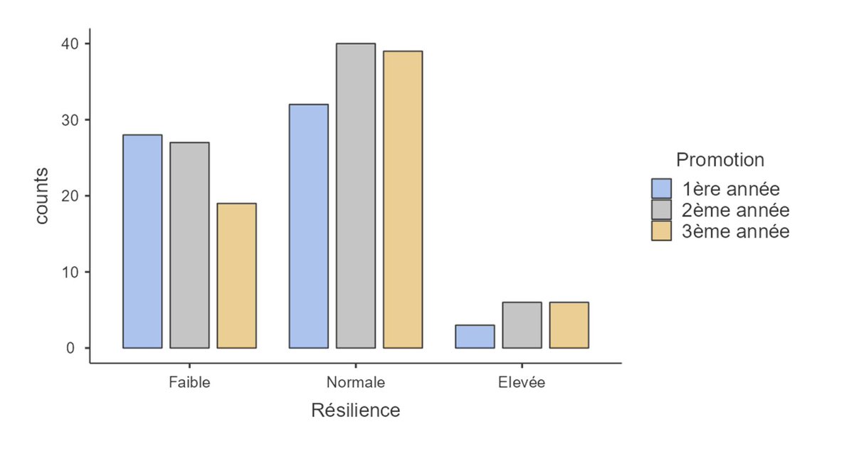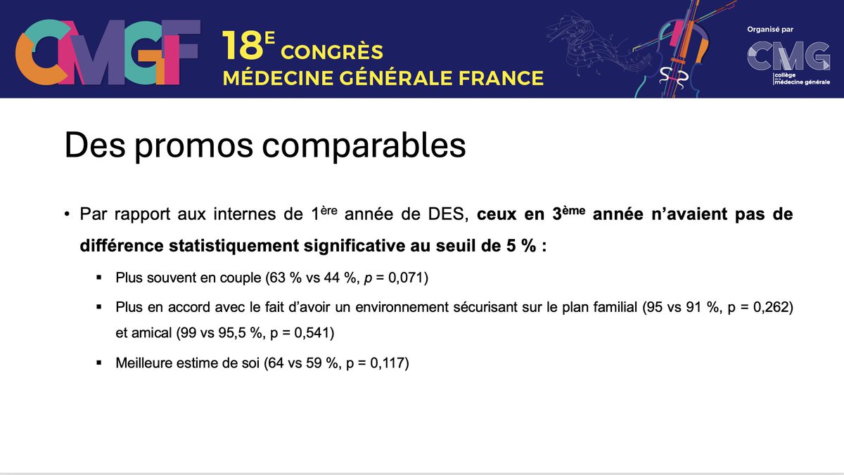 #CMGF2025 La résilience s'améliore entre la 3è et 1ère année d'internat (3,41 vs 3,08 ; p = 0,02).