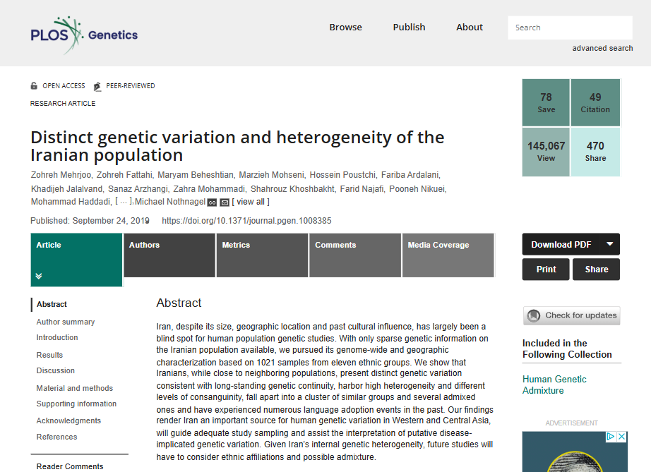 به عنوان کسی که پنج سالِ گذشتهی زندگیشو صرف مطالعه ژنتیک کرده و بیش از 15 مقاله در این زمینه منتشر کرده، بنظرم باید این مقاله دکتر نجمآبادی و همکاران که در سال ۲۰۱۹ در ژورنال معتبر PLOS Genetics منتشرشده رو بزنین توی دهن هرکسی که ادعای قومی-قبیلهای-نژادی در ایران میکنه/۱