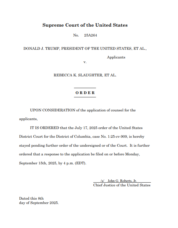 24/ Trump v. Slaughter, et. al. 25A264: Seeking stay of order reinstating members of FTC. Administrative stay granted. supremecourt.gov/search.aspx?fi…
