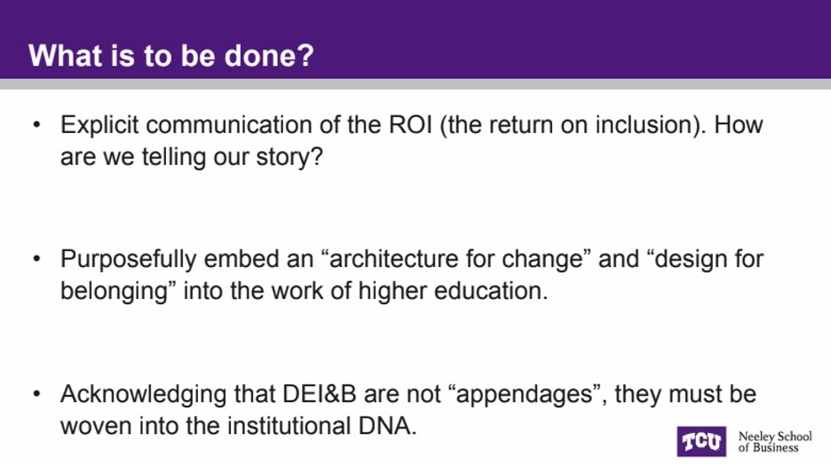 On November 21, 2024, TCU Chief Inclusion Officer Jonathan Benjamin-Alvarado told Business Faculty that DEI must be “woven into the institutional DNA.” /14