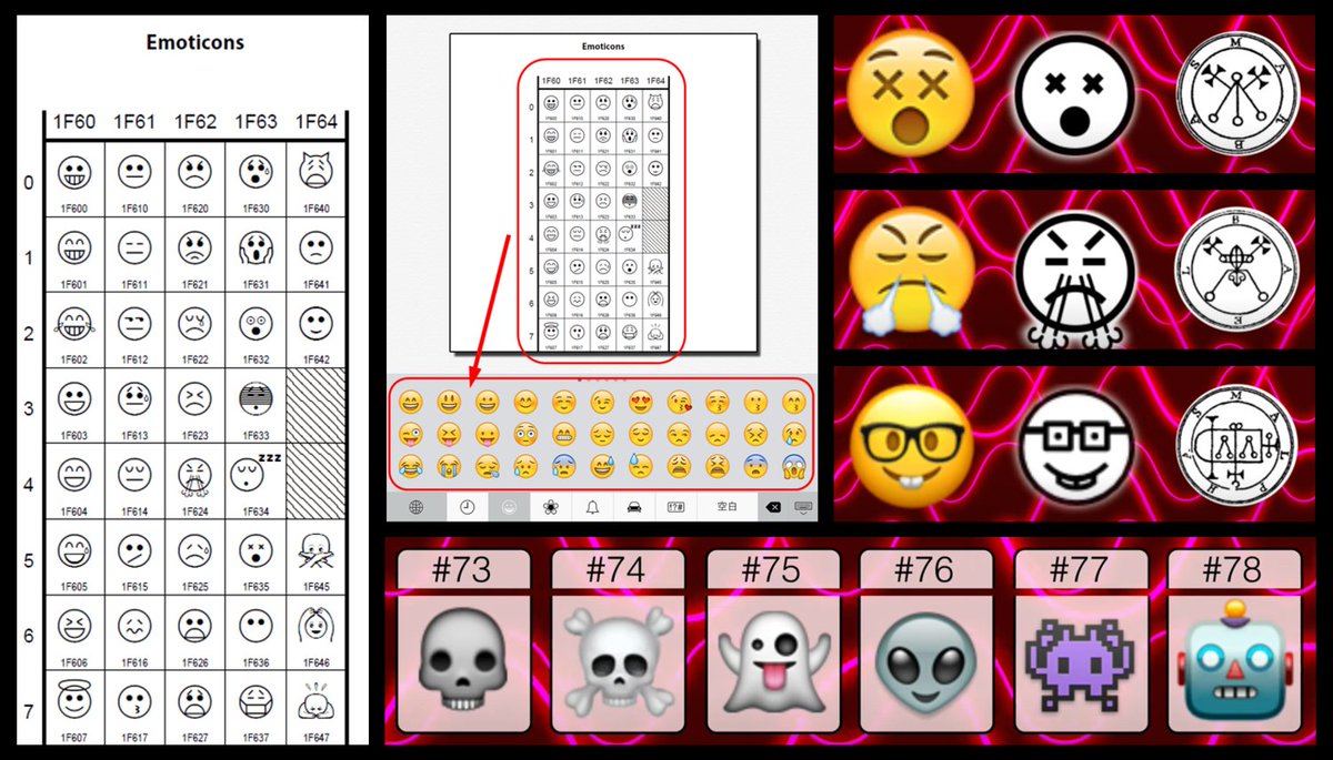 The original set of 72 emojis created for Mac, Windows, etc., bear a striking resemblance to the 72 demonic sigils in the Lesser Key Of Solomon, a Grimoire published 1650, which claims to have been written by King Solomon.