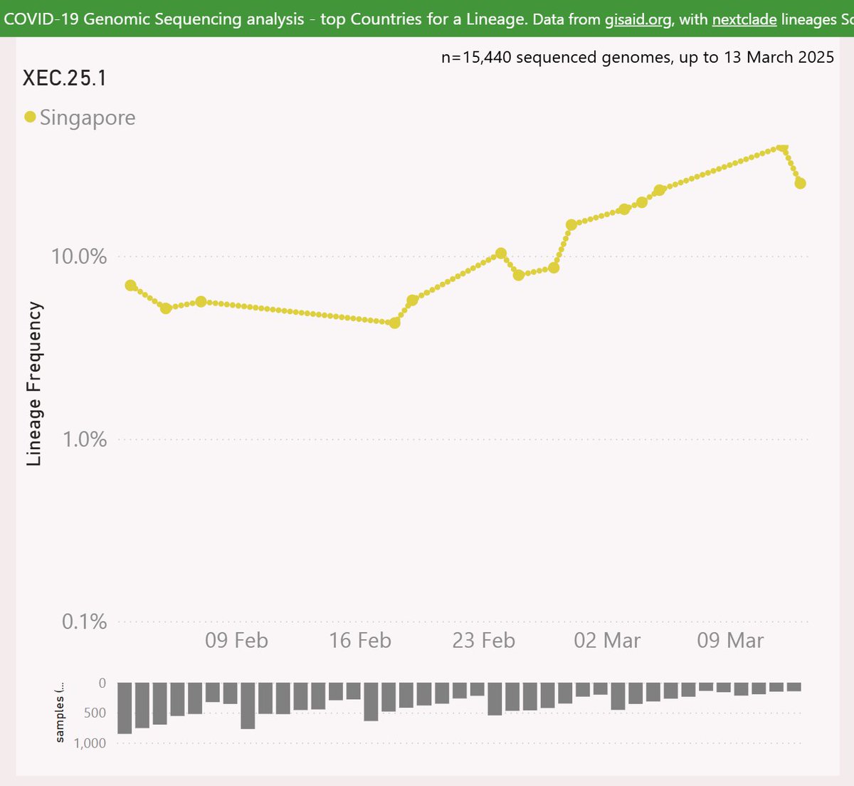 XEC.25.1 has only been reported from Singapore, rising to 40% frequency. Prior to this sub-lineage, the XEC.* variant had not been dominant in Singapore.